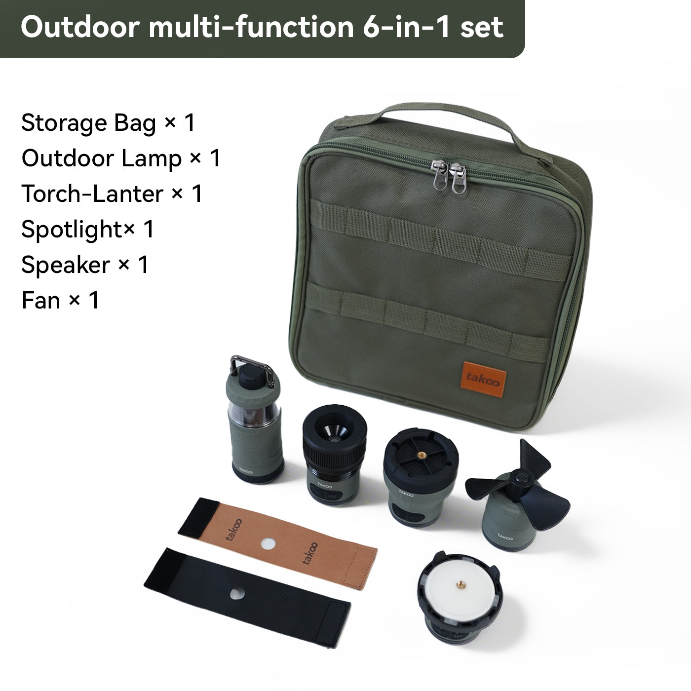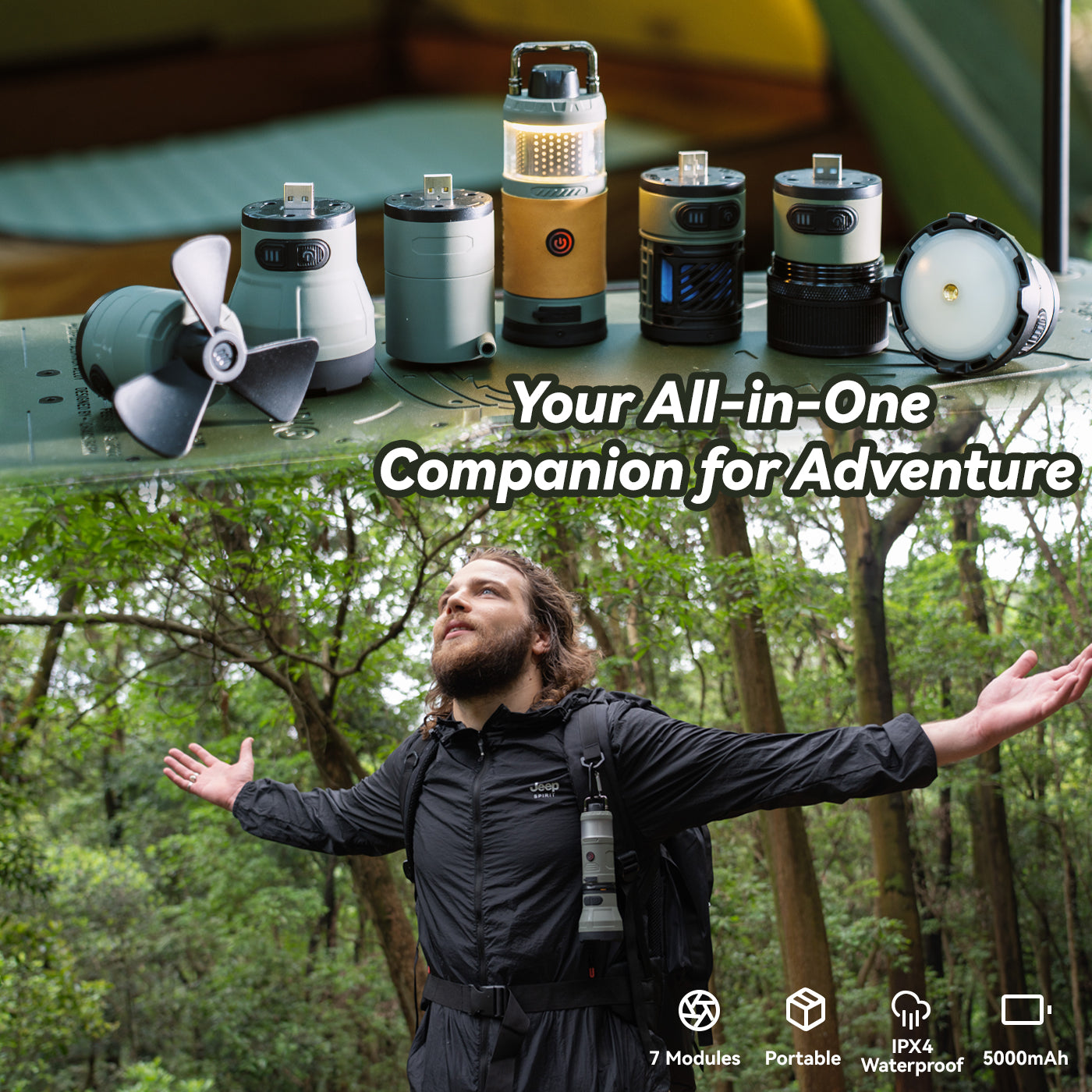 This portable device combines a powerful floodlight, spotlight, ambient light, fan, air pump, bluetooth speaker, and even a power bank.
